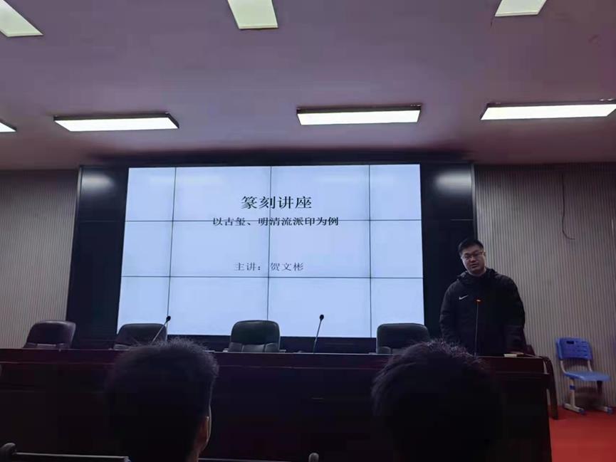 12月14日晚,书法专业青年教师贺文彬在逸夫楼报告厅开展了“篆刻讲座——以古玺、明清流派印为例”的讲座,书法专业部分师生聆听讲座。