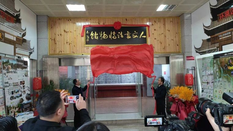 开馆仪式后,举行了“人文书法博物馆”揭牌仪式。刘铁铭和盛明科共同揭下了馆牌上的红绸带,“人文书法博物馆”七个行书大字金光闪闪,光彩夺目。
