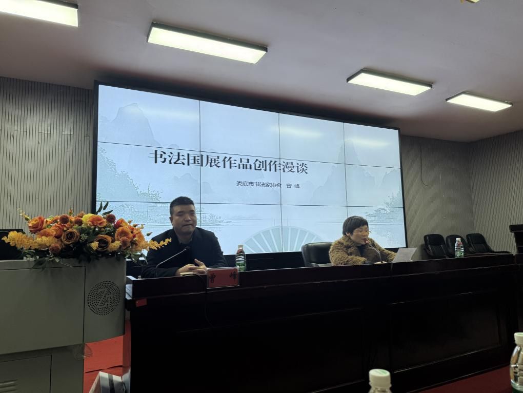 3月4日15时,beat365中文官方网站美术与设计学院一楼报告厅内迎来了一场以“书法国展作品创作漫谈”为主题的学术讲座。中国书法家协会会员、国家艺术基金青年艺术创作人才、湖南省青年书协副主席、娄底市书法家协会主席曾峰应邀主讲,讲座由美设院副院长贺平主持。