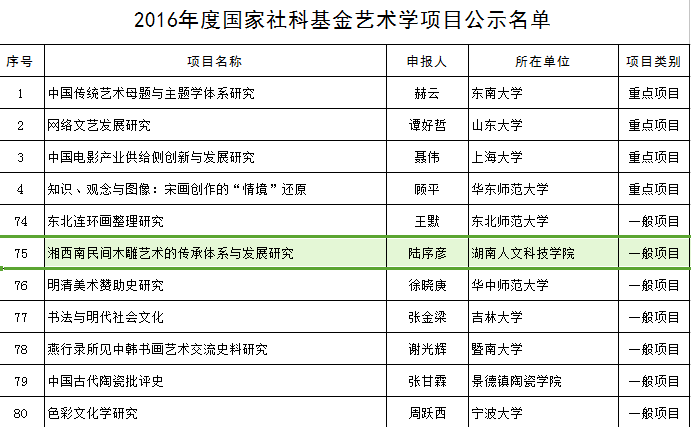 日前,根据全国艺术科学规划办公室颁发的相关文件通知,学院副教授陆序彦申报的《湘西南民间木雕艺术的传承体系与发展研究》项目(编号16BF075)获得国家社科基金艺术学项目立项。该项目重点研究木雕传承人个案、木雕的功能、渊源与流变及其在农村生活中的应用和发展关系。