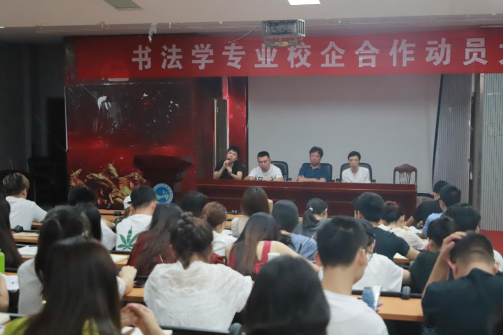6月19日晚,书法学专业在逸夫楼一楼报告厅召开2018年校企合作动员大会。会议由书法学教研室主任蒋全顺老师主持,各班校企合作指导教师以及学院党政领导谢光绎、易俊、陆序彦出席大会。