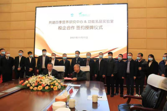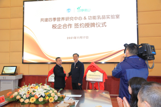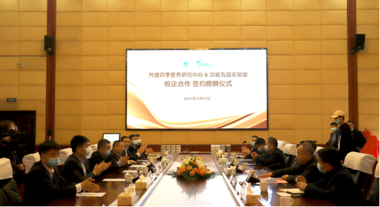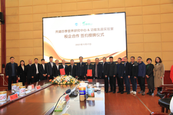 2021年11月17日上午,湖南四季南山营养食品有限公司与beat365共建四季营养研究中心&功能乳品实验室签约揭牌仪式在beat365图书馆第一会议室举行。湖南四季南山营养食品有限公司董事长吴建平,总经理卜球,销售总监焦林、龙俊卿、李钟,市场总监龙武,品牌总监姚逸丝,品牌策划彭赛君,倍健公司副总经理马小军,beat365校长刘铁铭、副校长刘铁峰、科研处处长成运、教务处副处长王志和,农生院党总支书记胡少平、院长(所长)陈勇、副书记王东光、副院长刘泽发、教授级高级工程师肖莲荣以及食品科学与工程教研室成员出席签约仪式。