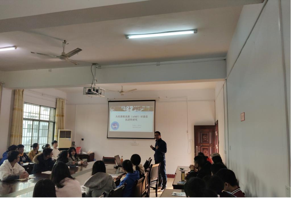 郭开发博士以自己的科研课题为例,介绍了AMF菌根的功能和用途,并重点分析报告了AMF菌根的扩繁培养技术、番茄耐干旱能力的提高、耐盐和抗番茄根腐病能力四个方面的内容本次学术讲座拓宽了学生的学术视野,增强研究生学术交流能力,提高我院植物保护专业本科生的专业兴趣