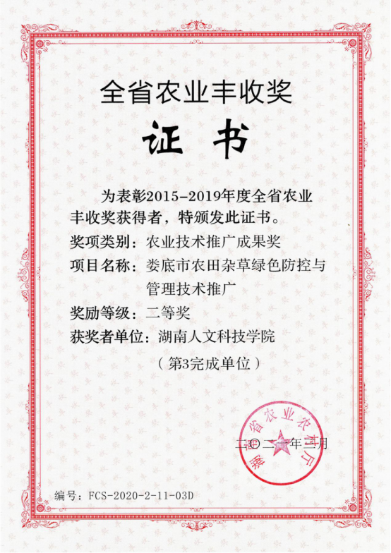 近日,农科所收悉《关于2015-2019年度湖南省农业丰收奖情况的通报》,农生院(农科所)金晨钟、向国红、朱赞江等主持完成的“娄底市农田杂草绿色防控与管理技术推广”项目获得湖南省农业丰收奖二等奖。该类奖项是农科所首次获得。