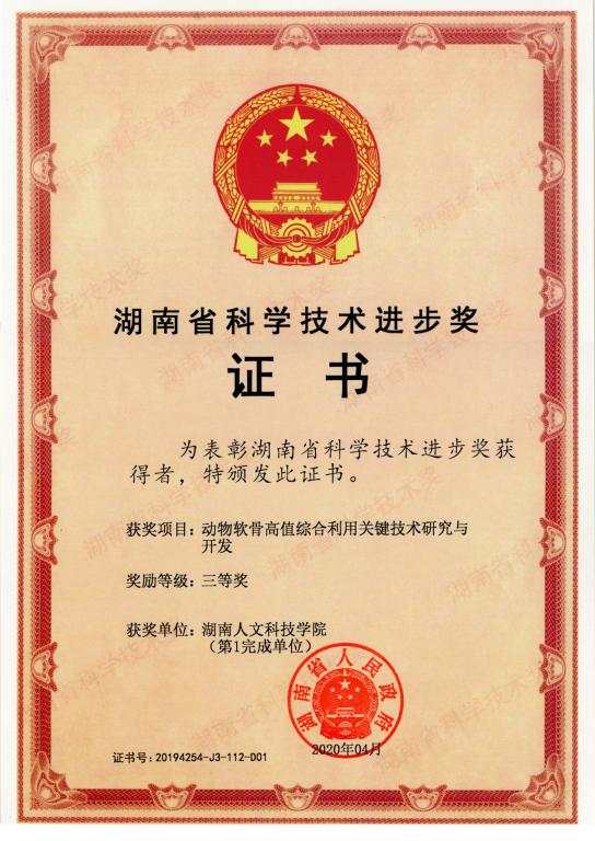 beat365作为第一完成单位,联合湖南伍星生物科技有限公司申报的《动物软骨高值综合利用关键技术研究与开发》项目成果,经湖南省科学技术进步奖评审委员会评审,省科学技术奖励委员会审定,省政府批准,荣获湖南省科技进步三等奖。