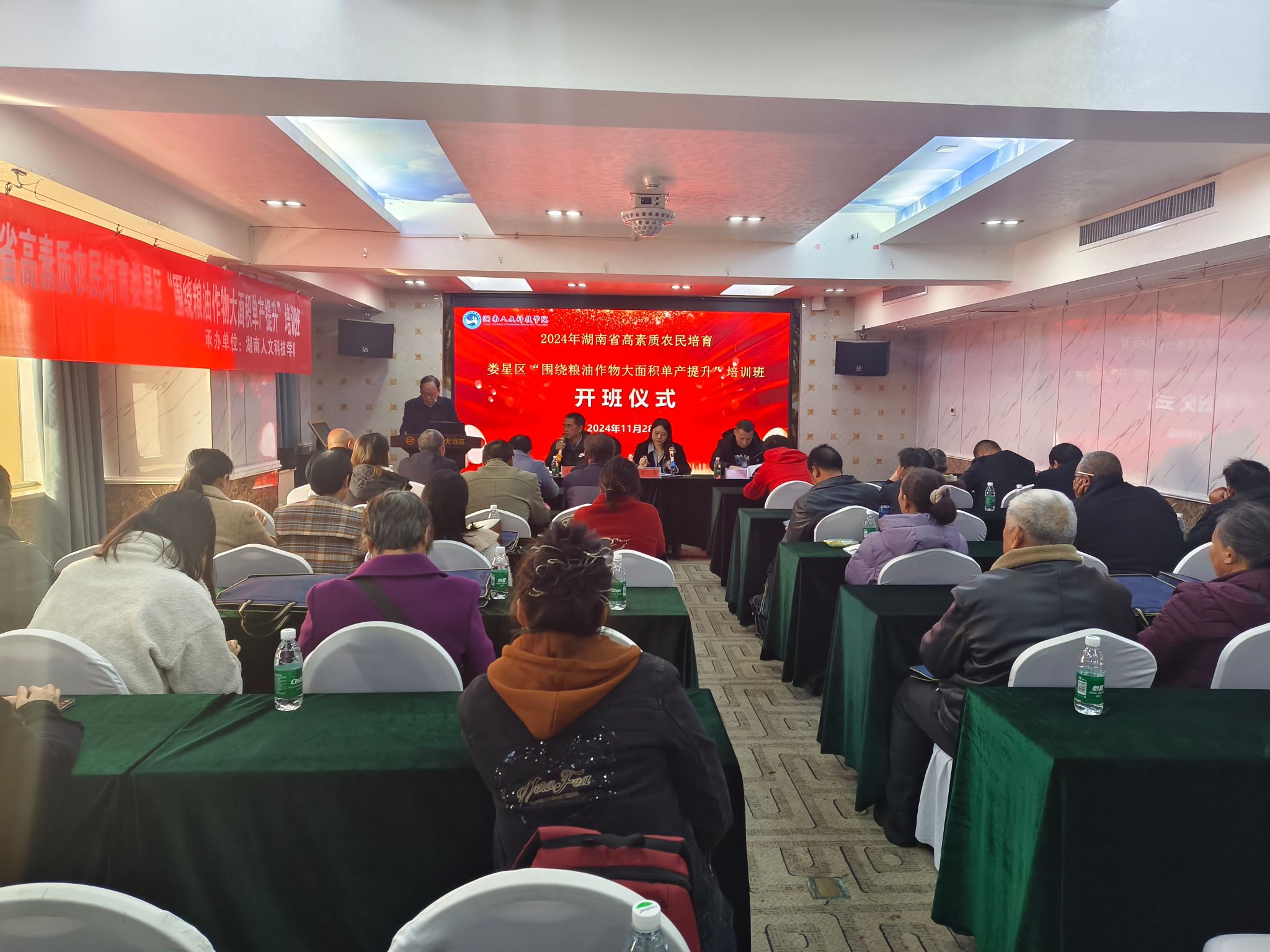 为全面推进娄星区乡村振兴,加快构建一支有文化、懂技术、善经营、会管理的高素质农民队伍,11月28日,beat365中文官方网站承办的2024年娄星区高素质农民培育“围绕粮油作物大面积单产提升”培训班开班。本次培训班在财智国际大酒店举行开班仪式,开班仪式由康林峰推广研究员主持,beat365中文官方网站农业与生物技术学院副院长朱赞江,娄星区农业农村局领导李晶、李畅等出席开班仪式。