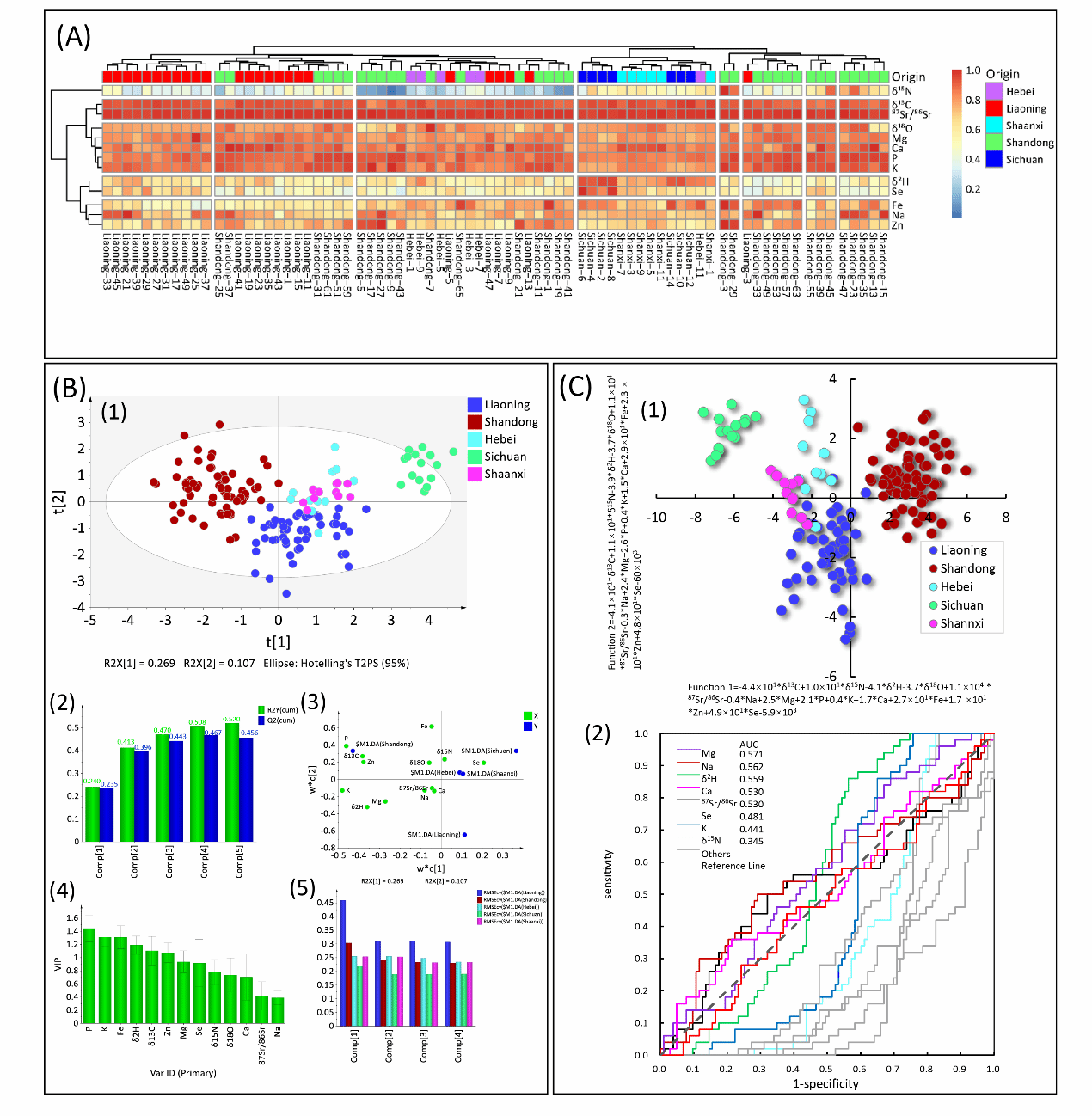 图(1)中国樱桃原产地分布及品种;(2)樱桃稳定同位素及元素特征与产地环境相关性分析,及区域差异;(3)HCA、PLS-DA和LDA建模判别结果