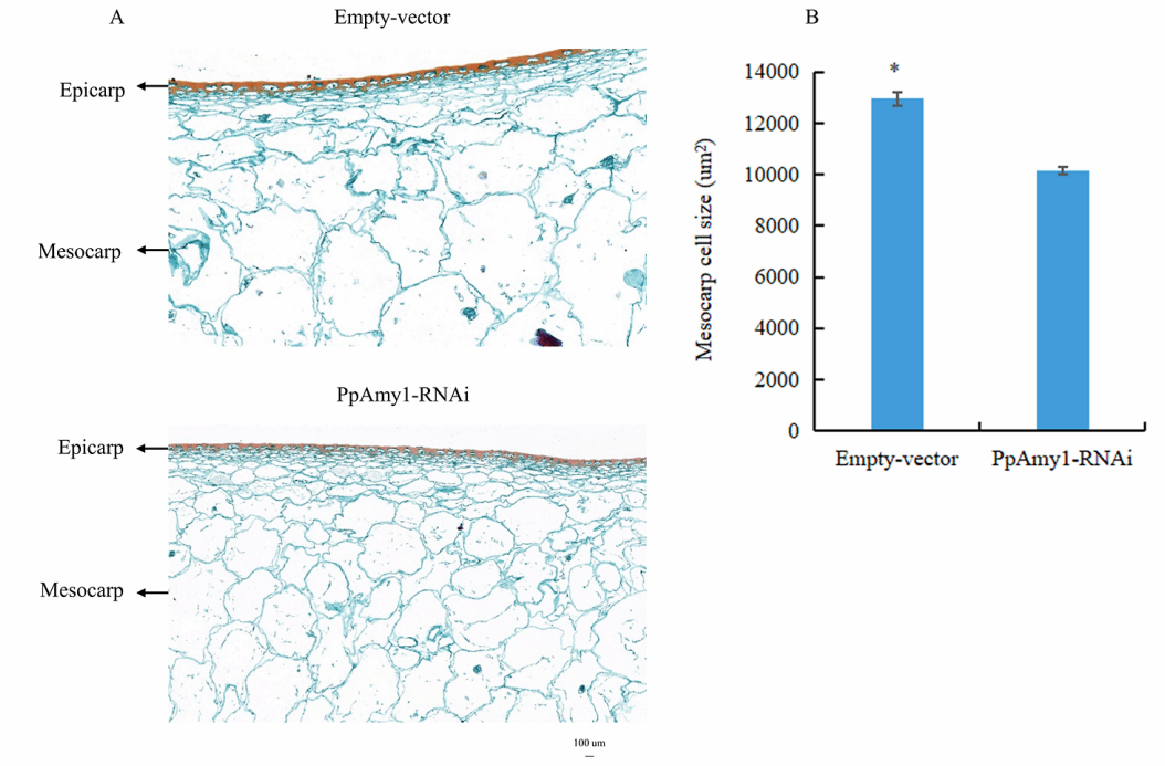 图2 PpAmy1基因沉默对油桃中果皮细胞微观结构和中果皮细胞面积的影响