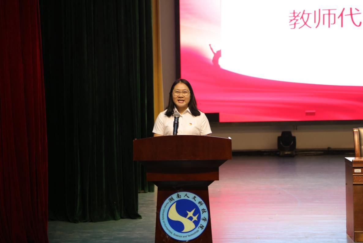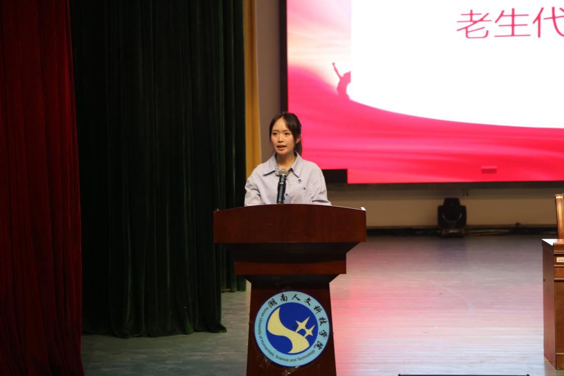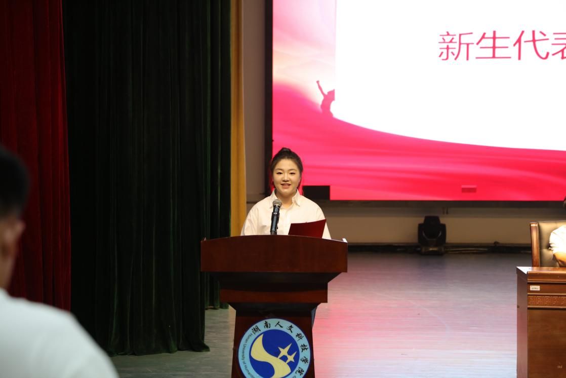 老生代表胡天培发言。她回顾自身成长,分享感悟:大学是挑战与机遇的战场,要立鸿鹄志、做好规划;要破舒适茧,勇敢挑战以激活潜能;要文明精神、野蛮体魄,以健康筑牢成长基石。