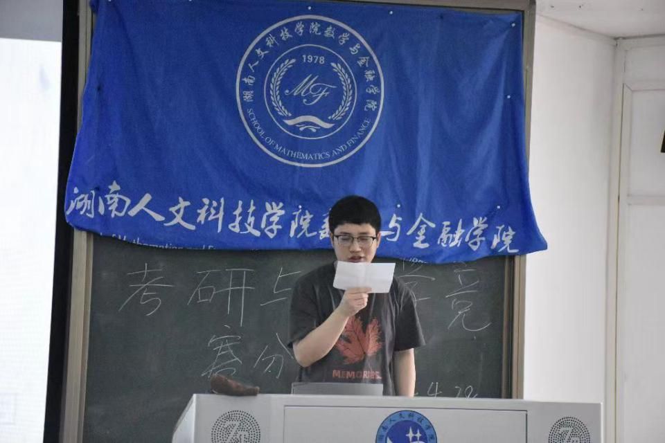 邱巧、周美程两位同学主要从数学竞赛的备赛准备、比赛注意事项、赛后总结分享了自己的参赛经历和心得体会。丁格、刘逵宇、刘丹、唐凤、文佳乐五位同学分别通过线下与在线上方式分享了自己的备考经验和“考研妙招”。吴斯对数学竞赛和考研的重要性进行了强调,同时鼓励大家积极参加各项比赛。