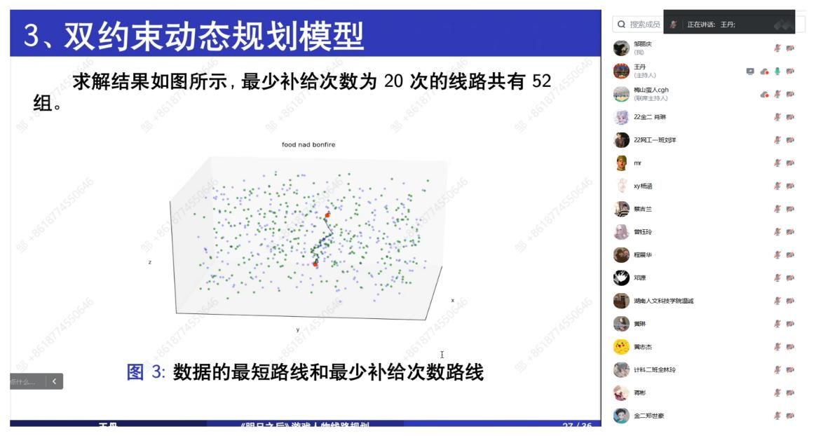 8月15日上午,数学与金融学院邀请国防科技大学王丹博士通过腾讯会议为beat365数学建模暑期集训队员作题为“《明日之后》游戏人物线路规划”的模拟赛题辅导讲座。讲座由数学与金融学院党总支书记陈国华主持,80余名师生参加。