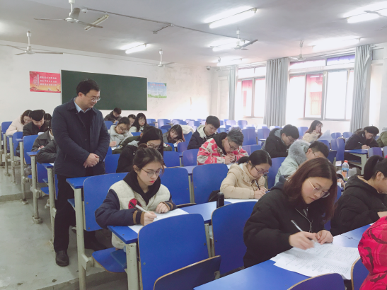 为深入学习贯彻党的十九大精神,结合“两学一做”常态化、制度化工作,根据学校《关于学习宣传贯彻党的十九大精神的实施意见(校党发〔2017〕37号)》的要求,数学与金融学院党总支于2018年12月14日中午,在致远楼412组织全体学生党员进行党的基础知识测试,此次测试采取集中考试、闭卷作答的方式进行,内容涵盖党的十九大精神、新修订的《中国共产党纪律处分条例》等内容。学生党支部书记张蔚老师与陈芳老师担任监考老师。我院党总支书记阳立新到现场为党员们进行考前动员和指导,要求党员们诚信参考,认真考试。测试中,各位党员认认真真审题,仔仔细细答题,把测试活动当作一次学习研究的过程,真正达到了以考促学、以学促进的目的。