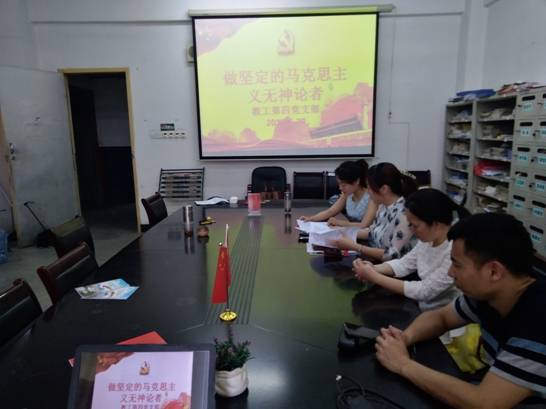 2019年5月23日下午4点,数学与金融学院教工第四党支部在致远楼413开展“做坚定的马克思主义无神论者”主题党日活动,支部全体党员参加本次活动,会议由支部书记刘纯英主持。