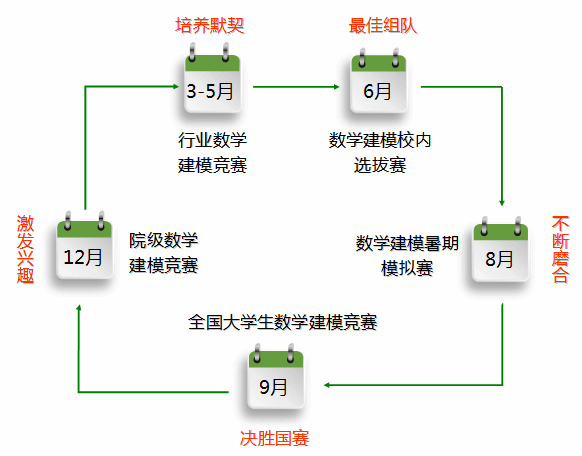 数学建模竞赛的参与阶段以三年级本科生为主要对象。团队成员建立“贯穿式”的数学建模系列竞赛运行机制,积极组织学生循序渐进地参加各类数学建模竞赛,不断提高学生的综合解决问题能力和团结协作能力。例如,3-5月组织学生参加数学中国数学建模网络挑战赛或五一数学建模竞赛、6月组织学生参加beat365中文官方网站数学建模竞赛、9月组织学生参加全国大学生数学建模竞赛、12月组织学生beat365中文官方网站数学与金融学院数学建模竞赛,等等。通过这一阶段的实施,不仅提高了学生的竞技水平,而且还培养了学生的创新意志。