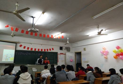 班会前,2017级各班学生都在积极布置会场。在歌曲《春天的故事》的伴随下班会开始了。首先,主持人以PPT的形式为同学们介绍了新时代中国特色主义思想以及中国过去五年里的工作和历史变革。过去五年的中国在城市建设方面、交通方面、扶贫政策上都取得了很大的成就,人民群众的物质文化生活也发生了巨大变化。随后,通过播放一段关于十九大的视频向同学们介绍十九大相关精神,使同学们更深入学习习总书记提出的新时代中国特色社会主义思想,进一步了解十九大精神。