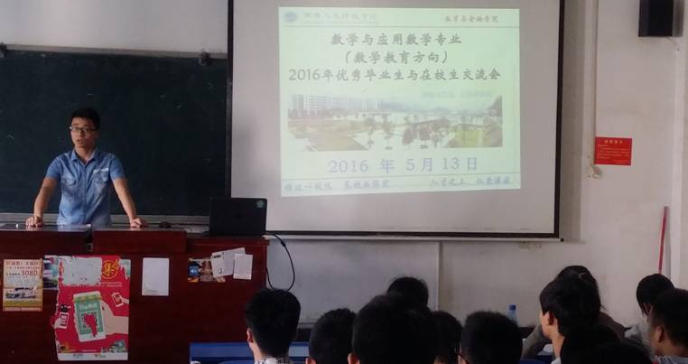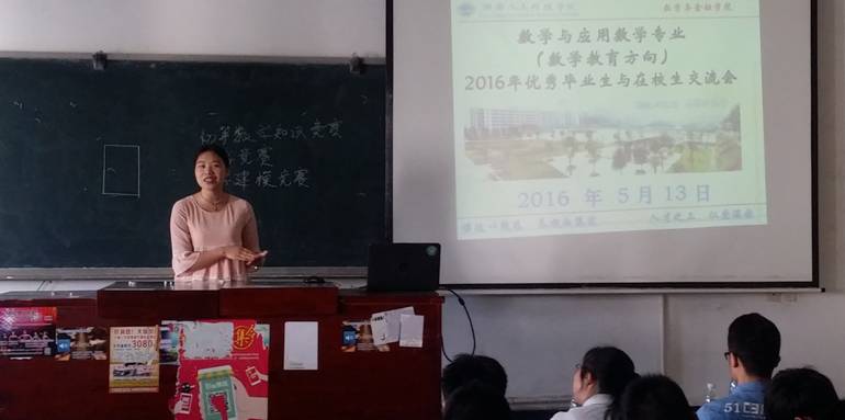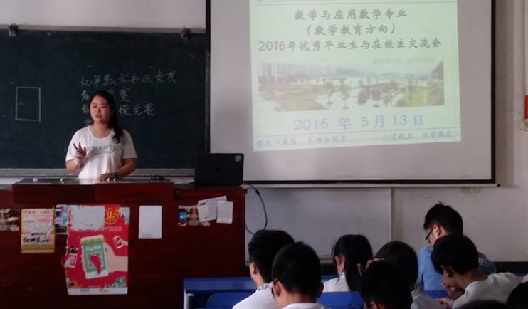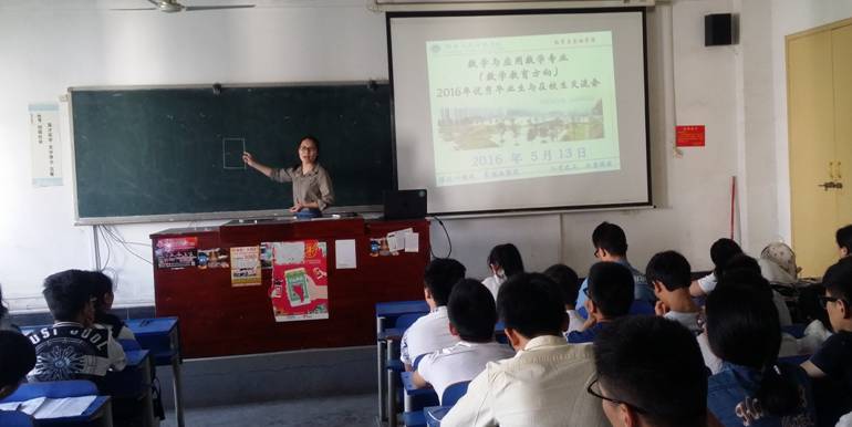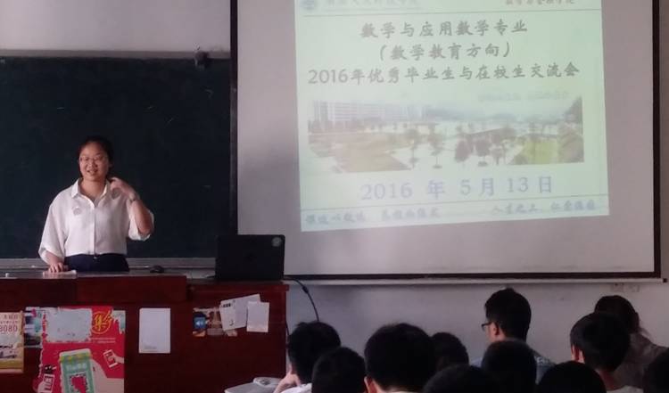 5 13 ,数学与金融学院数学教育方向2016年优秀毕业生与在校生交流会在致远楼412教室成功举行。本次交流会由数学与应用数学教研室负责具体组织,其目的在于通过优秀毕业生分享成功的经验,更好地促进在校学生合理规划各自的大学生活,并为本专业不同年级学生搭建相互交流学习的平台,起到帮助学生健康成长的同时促进专业建设良性发展的作用。