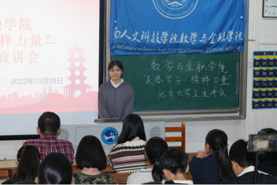 为挖掘和宣传我院学生积极进取、拼搏奋进的感人事迹和先进典型,在当代大学生中树立自强、自立的榜样。10月28日晚,数学与金融学院在学而楼209教室举办了“芙蓉学子·榜样力量”优秀大学生宣讲会。学院全体辅导员、团学会主要干部和各班主要班委参加了会议,其他各班学生通过腾讯会议进行直播观看。