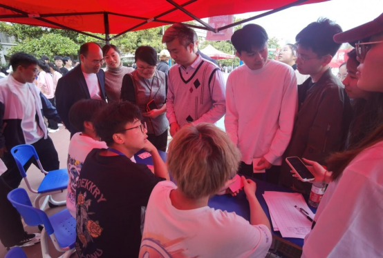 开幕式后,各位领导老师莅临宇光球场“数学游园会”现场指导。