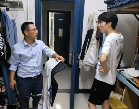 在学生寝室,领导老师们与同学们亲切交流,询问新生对新环境的适应情况,解答同学们在学习、生活上的各类问题,叮嘱学生国庆出行注意安全。随后,老师们还对同学们的寝室内务进行了检查,告知同学们一定要注重寝室安全,遵守学校的规章制度,不使用违规电器,做到人离电断,做好安全防范措施,避免发生宿舍安全事故。