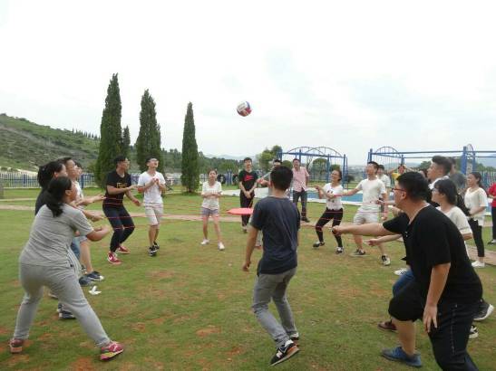 当天上午10点,所有活动人员在CS野战开展之前,由教练先开始进行破冰热身运动“松鼠与大树”。每三人自由组成一支队伍,两人为大树,一人为松鼠。起大火时,同一支队伍的大树与对面大树交换位置,而发洪水时,松鼠与对面松鼠交换位置。经此几轮,教练选出五位未躲过灾难者进行“奖励”,该项目活动在同学们的欢歌笑语声中圆满结束。随后正式开始CS野战,人员自由组成两支队伍,穿好装备,进入作战区域。第一轮作战区域为平地,每人各有十条生命,阵亡后须退出平地,以对方成员全部阵亡为胜利标准。第二轮作战区域扩大到斜坡,每人只有五条生命值,胜利标准不变,但每支队伍由教练随机安插了一至两名卧底,增加了项目难度。经过两轮作战,队伍与队伍、成员与成员之间友谊逐渐深厚,营造了良好的团队气氛。下午2点后,团队进行了三个项目:同心鼓、百米障碍赛以及毕业墙。其中百米障碍赛以穿越轮胎、平衡木和跨栏的时间长短作为比赛标准,两支队伍各派出八男八女,以接力赛形式比拼。随着时间逐渐推移,一天活动行程也逐渐落幕。