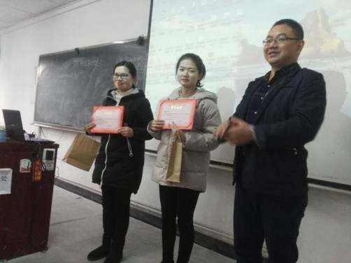 李炳君副院长在比武前肯定了2014级师范生在教育实习过程中的表现,并对2015级、2016级全体师范生提出共同的要求,要求大家在平时的学习中要努力加强理论学习,注重师范素质的培养,以理论为基,实践为本。然后就此次教学比武的活动流程、活动要求做了简单的介绍。接着,参加教学比武的7名学生代表依次上台进行展示,以饱满的激情完成各自教学内容。在激励的角逐中,张依林、陈琳慧荣获本次教学比武一等奖,王莹、蒋茜荣获二等奖,谢显静、钟丽华、袁磊荣获三等奖。