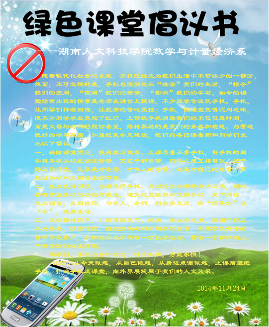 同学们,手机乃身外之物,唯有知识,方能永恒!让我们从今天做起,从自己做起,从身边点滴做起,上课前拒绝手机,拒绝手机进课堂,向外界展现属于我们的人文风采。