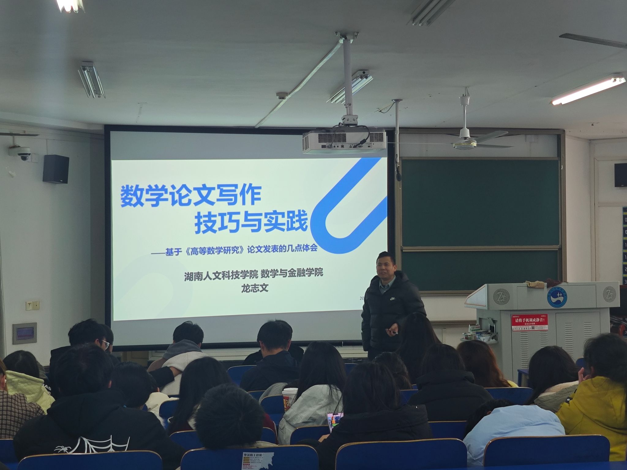 龙志文博士以《数学论文写作技巧与实践——基于<高等数学研究>论文发表的几点体会》为题,通过介绍数学论文选题和写作技巧,讨论了数学论文选题的几个案例,并分享在《高等数学研究》发表论文的几点体会,以期激发学生们数学论文写作热情。