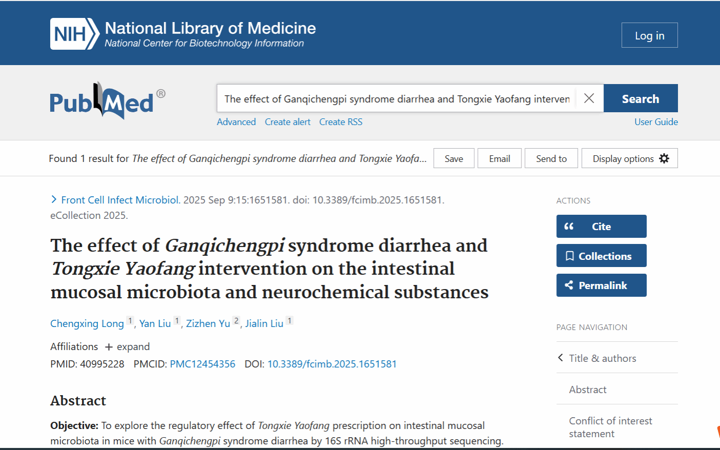 近日,学院龙承星博士团队在国际重要期刊《Frontiers in Cellular and Infection Microbiology》(2025年中科院二区,IF 9.0)上发表题为“The effect of Ganqichengpi syndrome diarrhea and TongxieYaofang intervention on the intestinal mucosal microbiota and neurochemical substances”的研究论文。