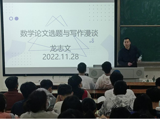 为提高学生对数学论文选题与写作的认识,龙志文博士特于11月28日晚在学而楼309为数学与金融学院数学与应用数学专业的学生们做了题为“数学论文选题与写作漫谈”的讲座。
