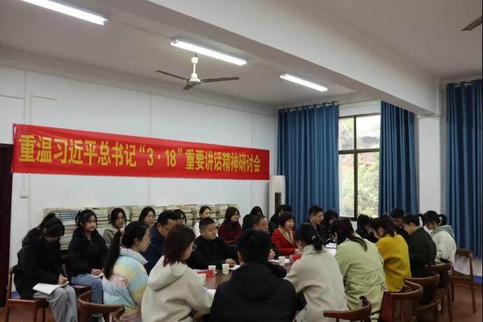 3月18日,在习近平总书记“3·18”重要讲话发表四周年之际,我院在若谷楼201召开了重温习近平总书记“3·18”重要讲话精神研讨会。学院党总支书记李伶、院长、学科带头人张卫明、副院长杨国辉、党总支副书记周友出席研讨会,学院教授代表、部分学科骨干以及特邀中小学思想政治理论课教师代表、学术研习坊全体成员参加。研讨会由学术研习坊指导老师周浩主持。