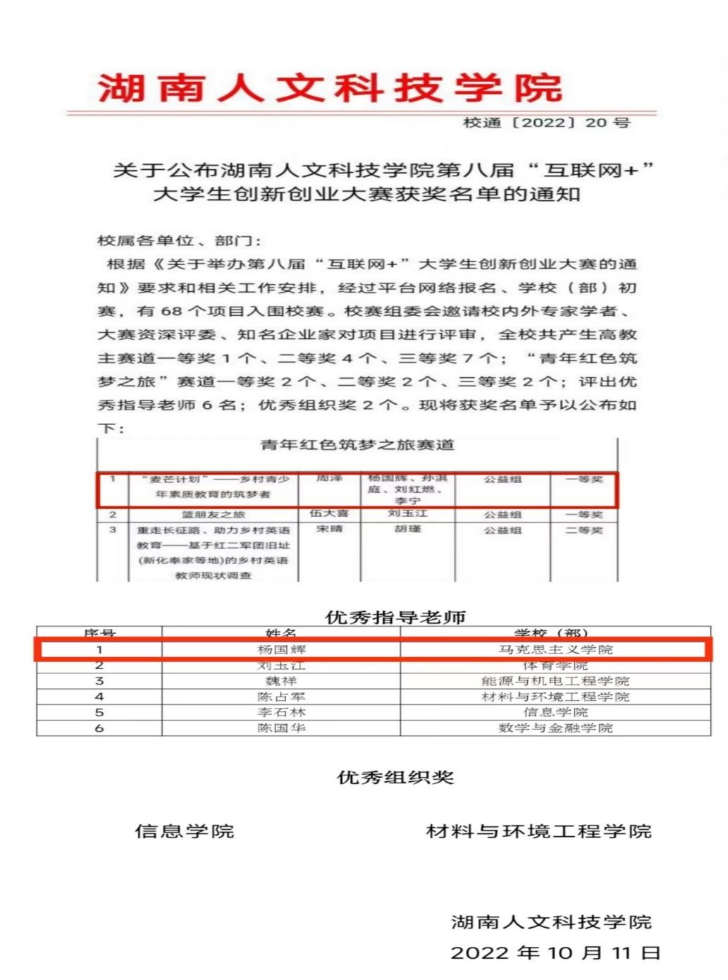 近日,从创新创业学院传来喜讯,由我院副院长杨国辉教授、孙淇庭等老师指导,19级思政1班周泽主持的《“麦芒计划”——乡村青少年素质教育的筑梦者》在学校第八届“互联网+”大学生创新创业大赛中,荣获“青年红色筑梦之旅赛道”公益组一等奖。我院副院长杨国辉教授获“优秀指导老师”称号。