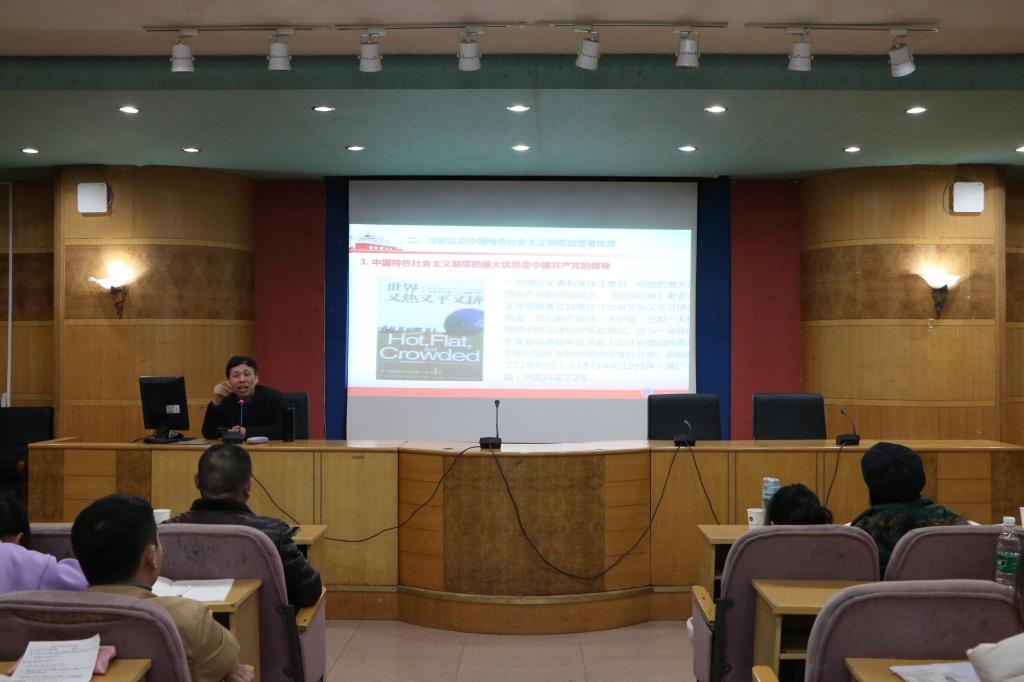 12月2日晚,教育部“长江学者”特聘教授、博士生导师、湘潭大学李佑新教授,应邀于养根楼多媒体报告厅为我院作了以“我们的制度优势与努力的方向——十九届四中全会《决定》解读”为主题的讲座。此次讲座由我院院长张卫明教授主持,院党总支书记游训龙教授、副院长杨国辉博士、袁承蔚博士、周玉文博士、李盼强博士、张小妹、孙淇庭、李嘉瑞等老师出席,我院18级,19级全体同学参加。