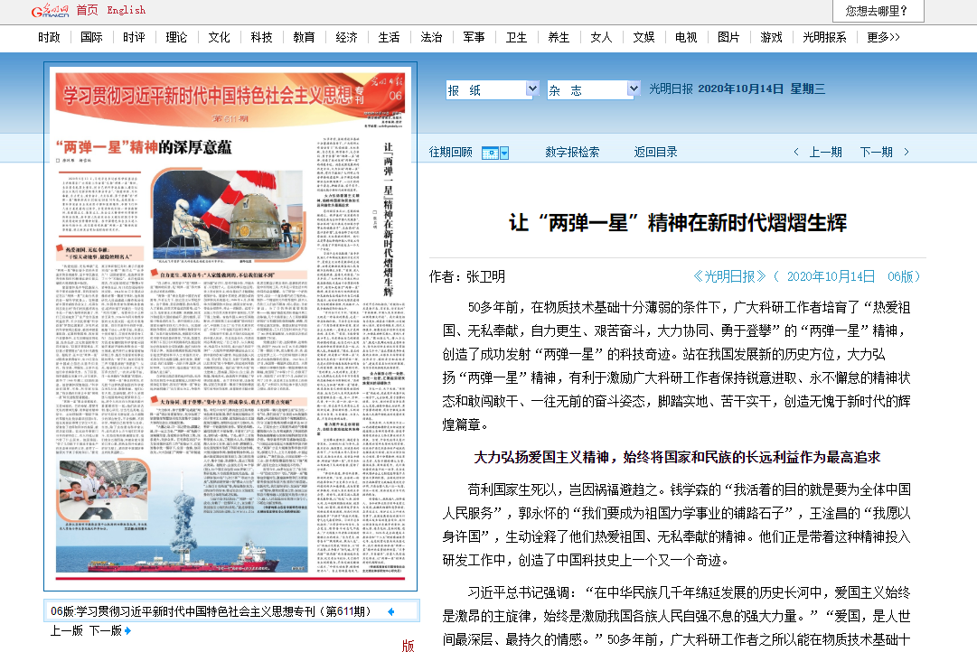 我院院长、马克思主义理论学科带头人、思想政治教育省一流专业负责人张卫明教授于2020年10月14日在《光明日报》(理论版)发表《让“两弹一星”精神在新时代熠熠生辉》一文。文章发出后,迅速被各地主要报纸和媒体杂志转载。这是张卫明教授第5次在《光明日报》发表理论文章。