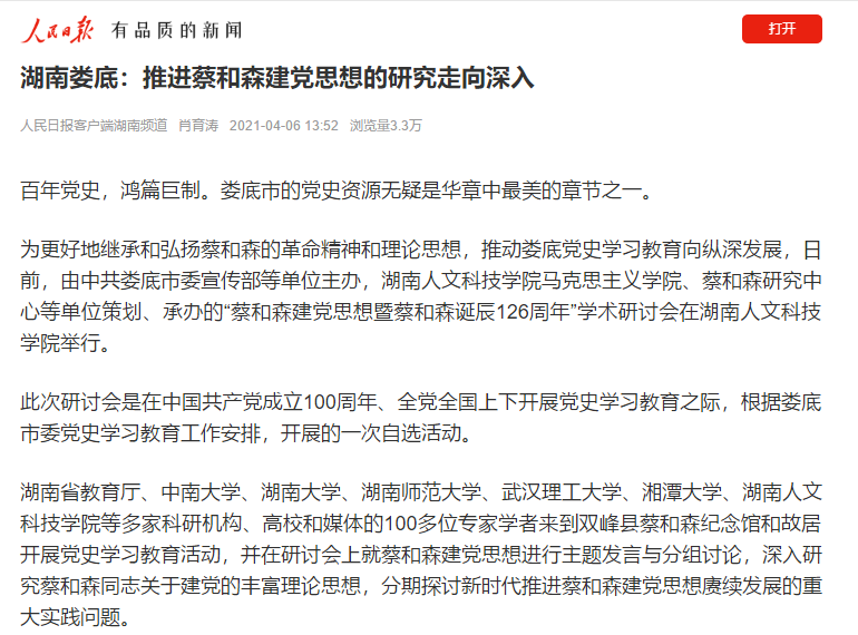 4月6日,人民日报以《湖南娄底:推进蔡和森建党思想的研究走向深入》为题报道了我院在3月28日举办的“蔡和森建党思想暨蔡和森诞辰126周年”学术研讨会的情况。