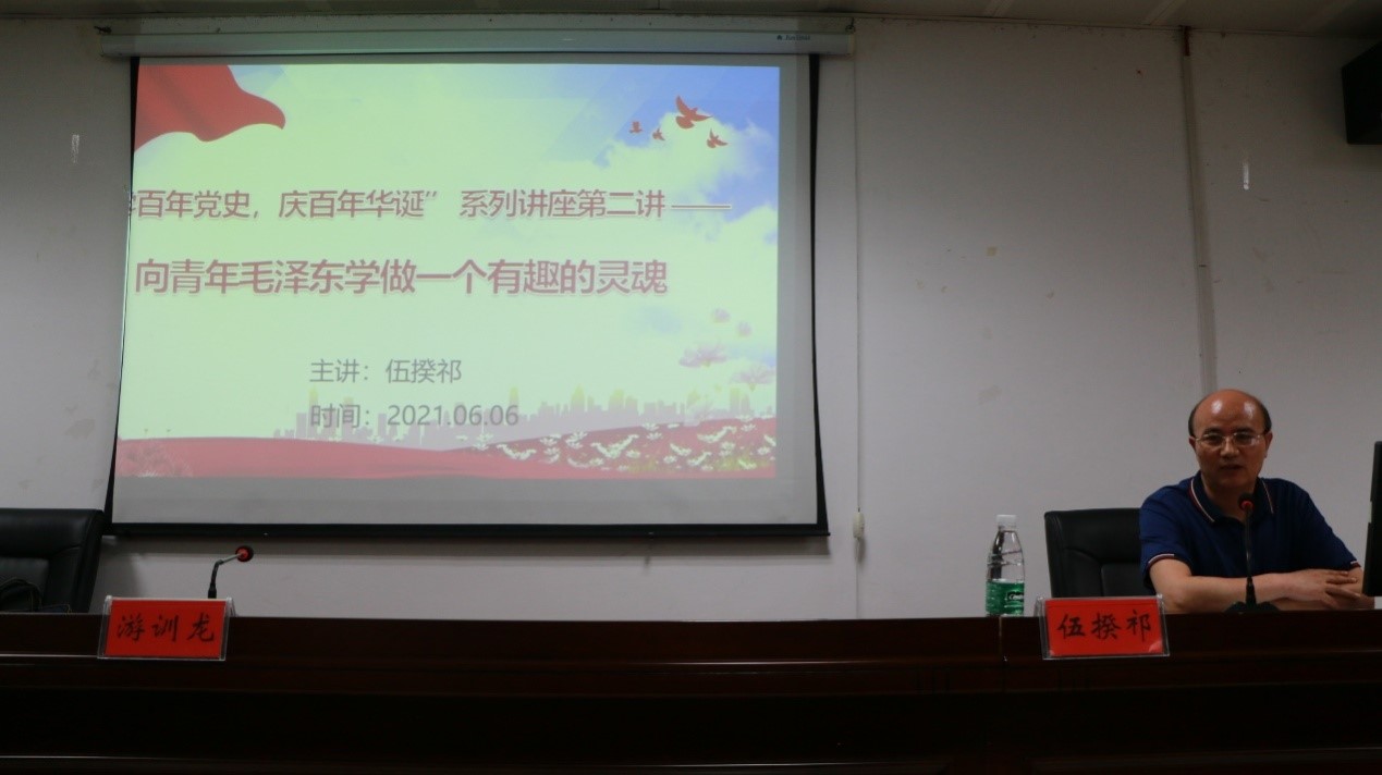 为隆重庆祝中国共产党成立100周年,引导广大大学生自觉学习党的光辉历史,坚定爱党爱国爱社会主义的信念,湖南省中国特色社会主义理论体系研究中心beat365中文官方网站基地、湖南省党的创新理论研究基地beat365中文官方网站基地与学校党委宣传部、团委在近期联合举办“学百年党史,庆百年华诞”系列讲座。6月6日晚,系列讲座第二讲在图书馆415学术交流中心开讲,由马克思主义学院伍揆祁教授主讲,党的创新理论研究基地常务负责人游训龙教授主持,中特理论基地秘书周浩博士、基地主要研究成员及beat365100多名学生听取讲座。