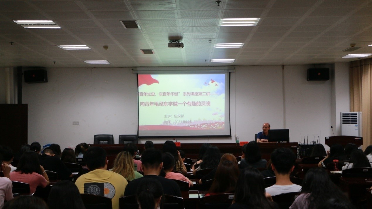伍揆祁教授主讲《向青年毛泽东学做一个有趣的灵魂》。他以对当前社会热点话题“躺平”现象的评析作为导入,引导年轻人深入思考应当如何树立正确的人生观、价值观以及如何储备以奋斗姿态坚定前行的精神动能。伍教授指出,作为新时代的大学生,我们开展党史学习教育,尤应学习老一辈无产阶级革命家的理想追求情怀和坚韧奋斗精神。随后,伍教授图文并茂地向大家展示了青年毛泽东平凡而又非凡的学生时代的学习、生活、修养、储能、交友等多个截面,验证着青年毛泽东确是一个可爱、可近、可学的大美青年。伍教授从青年毛泽东好像一个“怪人”的新颖角度出发,截取他是一个独特奇趣的布衣书生、一个钟爱体育的好玩伙伴、一个乐读“无字之书”的穷游学子、一个笃好交友的纯净君子等多维视角,采取案例讲授法、对比分析法等方式,有力说明了青年毛泽东是一个心怀梦想、胸罗大才、热爱生活、充满情趣的小伙,结合新时代立德树人目标,引导当代大学生心有梦想,端正人生态度,积极向上向善,立大志、储大能、显大为、成大业,并劝导大家青春是用来奋斗的,而不是用来挥霍的。他寄望大学生们从青年毛泽东身上吸纳放歌青春、追逐梦想的壮气浩气和精神动能,接续毛泽东的青春梦、奋斗梦,奋力谱写为实现民族复兴而砥砺前行的人生华美篇章。