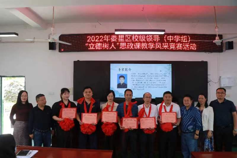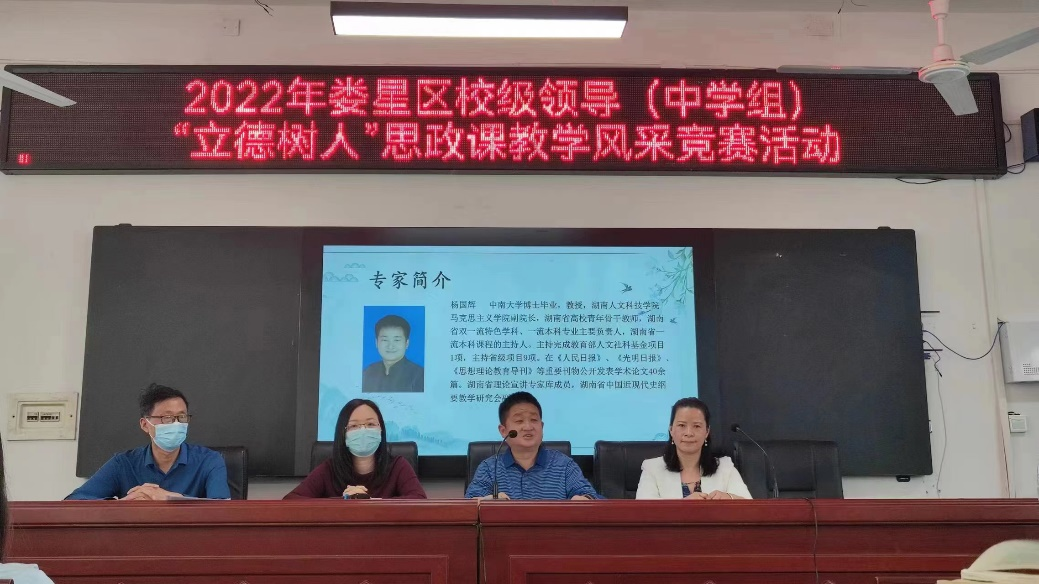 为全面落实《关于切实加强娄星区中小学思政课程建设的实施方案》工作要求,5月6日上午,2022年娄底市娄星区校级领导“立德树人”思政课教学风采竞赛活动在娄底四中拉开帷幕。本次活动由娄星区教育局、娄星区教育科学研究室主办,娄底四中承办,娄星区教育局党组书记、局长王晖,娄星区教育局党组成员、副局长唐固,娄星区教育局党组成员、副局长龚潘桃,娄星区教研室主任陈勇君等参加观摩了此次思政风采竞赛活动,我院副院长杨国辉教授受邀担任评审组组长。
