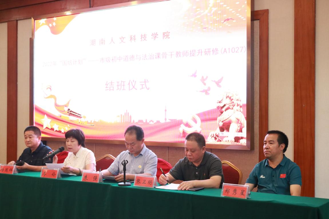 2022年9月28日上午,由我院承办的“国培计划”——市级农村初中道德与法治课骨干教师提升研修班结班仪式在豪莱雅酒店金和厅隆重举行,校党委委员副校长朱强、继续教育学院院长郑秀星、马克思主义学院党总支书记李伶、马克思主义学院院长张卫明、马克思主义学院副院长杨国辉出席结班仪式。仪式由马克思主义学院党总支书记李伶主持,马克思主义学院部分老师以及研修班全体学员参加。