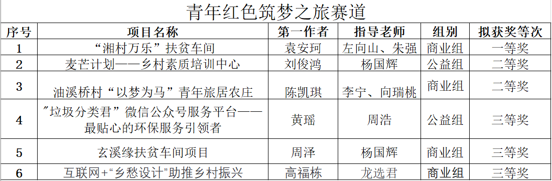 据悉,我院学生荣获一个二等奖,两个三等奖。其中,由副院长杨国辉博士指导,18级思政一班刘俊鸿负责的《麦芒计划——乡村素质培训中心》项目荣获二等奖,并成功入围湖南省第六届“互联网+”大学生创新创业大赛复赛。由周浩博士指导,18级思政二班黄瑶负责的《"垃圾分类君”微信公众号服务平台——最贴心的环保服务引领者》项目荣获三等奖。由副院长杨国辉博士指导,19级思政一班周泽负责的《玄溪缘扶贫车间项目》荣获三等奖。