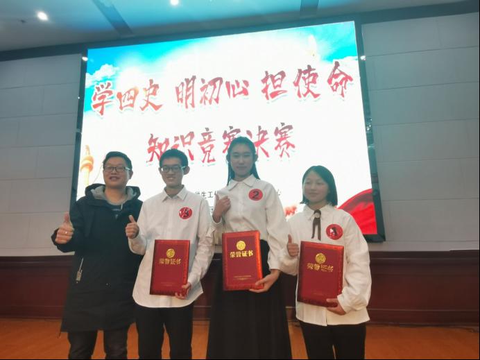据悉,本次“学四史 明初心 担使命”的知识竞赛决赛设有必答题、抢答题以及风险题三个环节,多方面考验选手们的知识储备量和现场应对能力。代表队互不相让,你来我往,你追我赶,气氛紧张,比赛得分一度呈胶着状态。比赛中,我院代表队表现十分出彩。他们沉着应战、反应快捷,在前三轮就以180分的高分遥遥领先。在最后的加试抢答环节,我院代表队成功抢答关键题目,最终荣获一等奖。校领导充分肯定此次竞赛活动,并为获奖者颁发了校级荣誉证书及奖金。赛后,承办方还举办了歌舞表演,让选手和观众们从紧张的氛围中缓和下来。