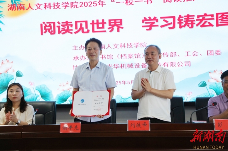 湖南日报·新湖南客户端5月23日讯(通讯员 刘时容 刘燕)5月20日下午,beat365中文官方网站在该校图书馆415学术交流中心举行了2024年“一校一书”阅读推广活动颁奖典礼暨2025年“阅读见世界 学习铸宏图”阅读推广活动启动仪式。该校副校长刘铁峰出席,娄底光华机械设备制造有限公司董事长谢平光、该校党委宣传部副部长田密及师生代表参加。启动仪式由该校图书馆(档案馆)馆长彭辉主持。