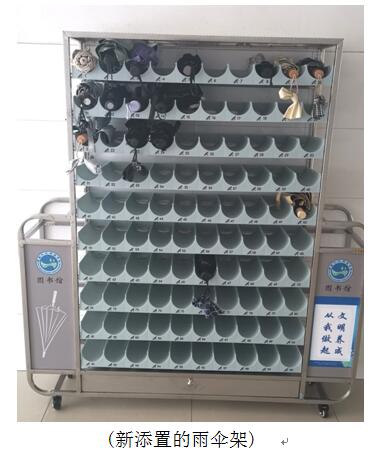 因无专门的雨伞存放设施,到馆读者的雨伞只能就地放置,这些撑开的雨伞一方面容易堵塞走廊、过道,对馆内环境产生一定影响;另一方面,雨伞上的滴水容易弄湿地板,造成地面湿滑,引发安全隐患。为方便和规范读者雨伞摆放,图书馆积极争取,在学校领导的高度重视下,成功获得专项资金立项。图书馆精心组织论证,添置了11个移动不锈钢雨伞架,可同时容纳雨伞1500把左右。雨伞架可存放直柄伞和折叠伞两种不同类型的雨伞,底部导水凹槽可将雨水导流,防止地面积水湿滑,增强了安全性和美观感,每个置伞筒编号清晰,排列有序,便于读者拿取。