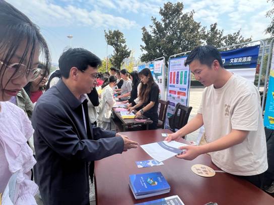 24日上午,图书馆联合中国知网、万方、超星、OFB外文文献、SpecialSci国道外文、Nextlib、MET全民英语、设计师之家、博学易知、起点考研数据企业在图书馆前坪开展了数字资源宣传和现场咨询活动,采用展板、发放小册子、现场演示、咨询答疑等形式,宣传介绍数字资源的内容、功能及使用方法。师生们对活动表现出了浓厚的兴趣,纷纷前来参与体验。陈志国亲临现场指导工作,认真听取各数据企业的资源介绍,与师生们亲切交谈,询问他们数字资源使用情况和图书资料阅读情况。陈志国希望广大学生多读书、读好书,树立远大理想,在推进强国建设、民族复兴伟业中绽放青春光彩;希望图书馆继续做好学科资源建设,加大资源宣传力度,促进信息资源与教学科研的深度融合,努力促进学校学科发展,共同推动学校“双一流”建设。