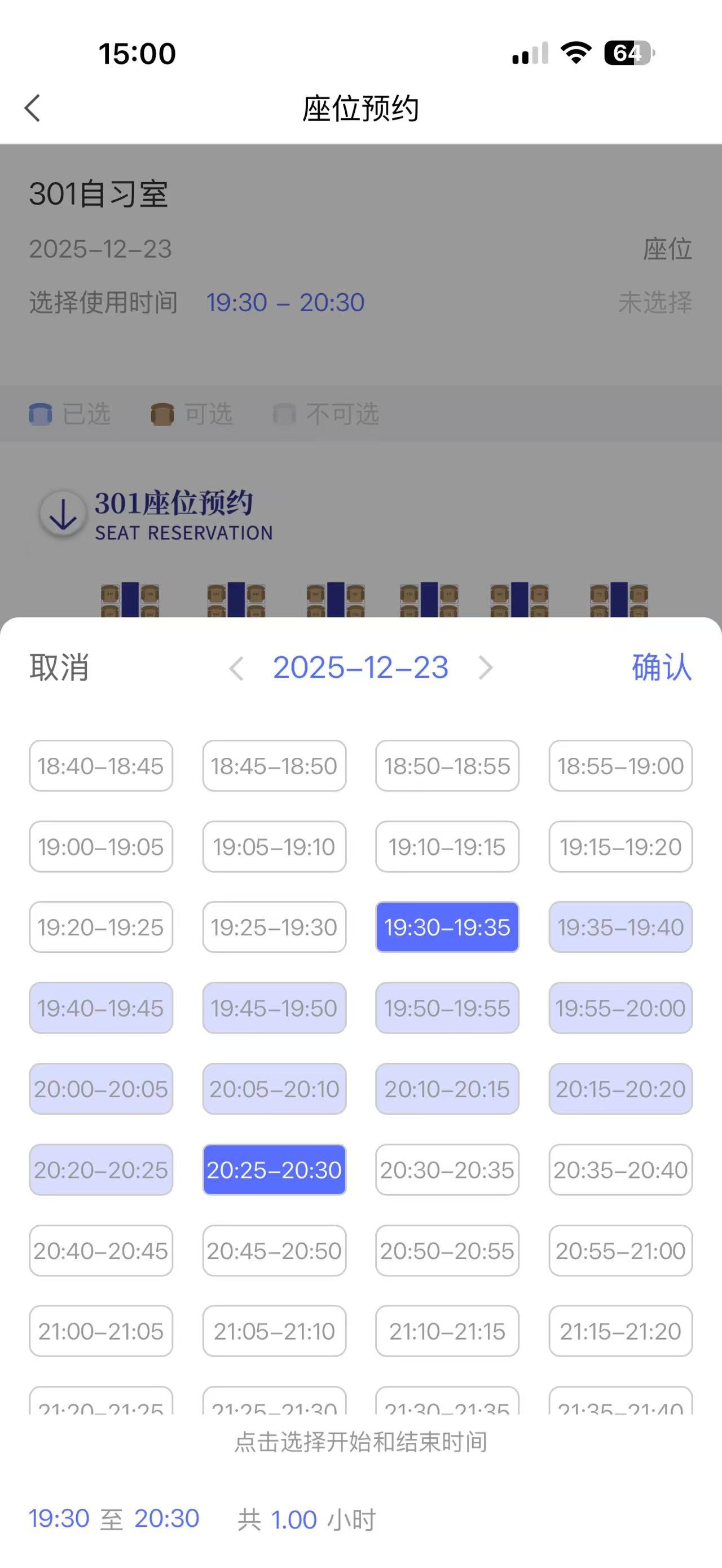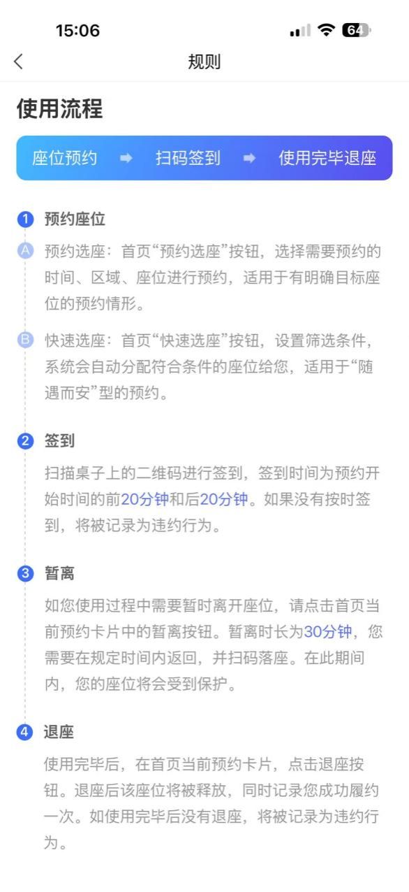 2、进入座位预约应用之后读者选座采用预约选座和快速选座(自选座位/快速随机分配)两种方式,读者可预约当天开馆时间的座位,21:00后即可预约次日开馆时间的座位。