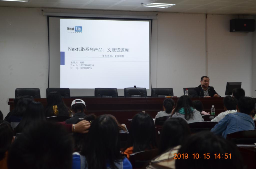 陈景和刘聘分别介绍了知网和Nextlib文献资源库的有关内容,详细讲解了各种数据库的资源优势及其使用方法,并作了现场演示。讲座还设置了有奖问答环节,现场读者积极参与,兴趣浓厚。