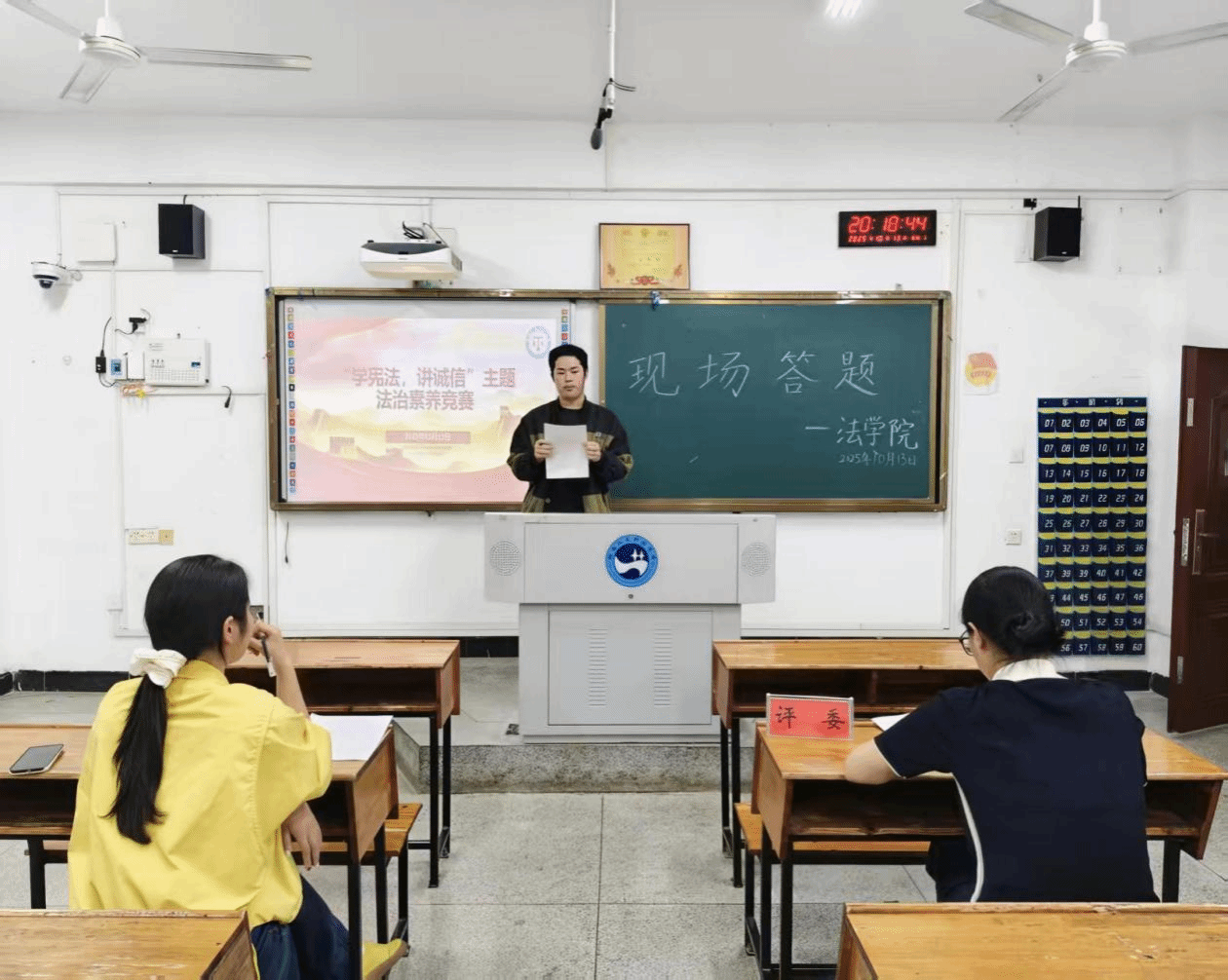 比赛分为笔试与现场答题两个环节。笔试中,选手们专注答题,监考人员严格履职,现场秩序井然。收卷后,现场答题环节拉开帷幕,选手轮流抽取题目,在1分钟准备时间内迅速构思,随后围绕法律问题展开阐述。他们逻辑缜密,部分选手还结合社会热点案例深入分析,充分展现了扎实的法治知识储备与出色的应变能力。