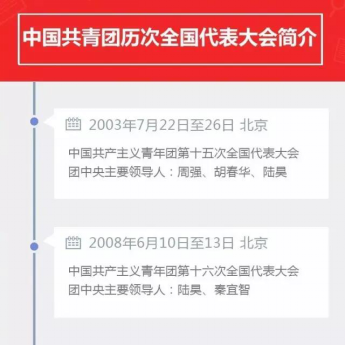 中国共产主义青年团第十六次全国代表大会于2008年6月10日至13日在北京召开。出席会议的代表1500名,代表全国7544万名团员。共青团十六大把科学发展观和“不断巩固和扩大党执政的青年基础”写入团章,明确了新的历史时期共青团的根本职责。