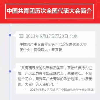 中国共产主义青年团第十七次全国代表大会于2013年6月17日至20日在北京召开。1524名来自全国各地的代表肩负着8900多万共青团员的重托出席盛会。习近平等党和国家领导人到会祝贺。秦宜智作了题为《高举团旗跟党走 奋力实现中国梦》的报告。报告阐明了当代青年的青春使命和中国青年运动的时代主题,提出了新时期共青团的光荣职责和做好工作的基本要求。大会对团章进行了修改,把科学发展观写入共青团的行动指南,对共青团的奋斗目标进行调整和充实,对现阶段共青团基本任务、共青团思想政治工作内容、团的建设基本要求的内容进行充实。