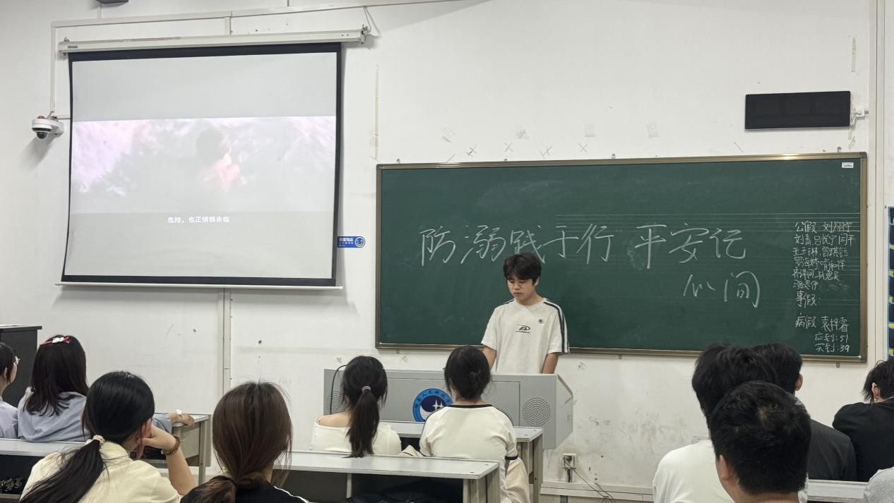 当晚,宣讲人员首先为同学们播放了防溺水警示教育视频。视频通过真实监控画面、救援纪实和家属采访,直观展现了溺水瞬间的惊险与生命消逝的惨痛,引发在场同学强烈震撼。随后台上讲解员深度剖析了夏季野泳、盲目施救、安全意识薄弱等典型。让同学们深刻认识到“敬畏自然、科学避险”的重要性。最后,讲解员向同学们演示了各种溺水发生时可以采取的措施,并传授遇险时保持冷静的实用技巧。