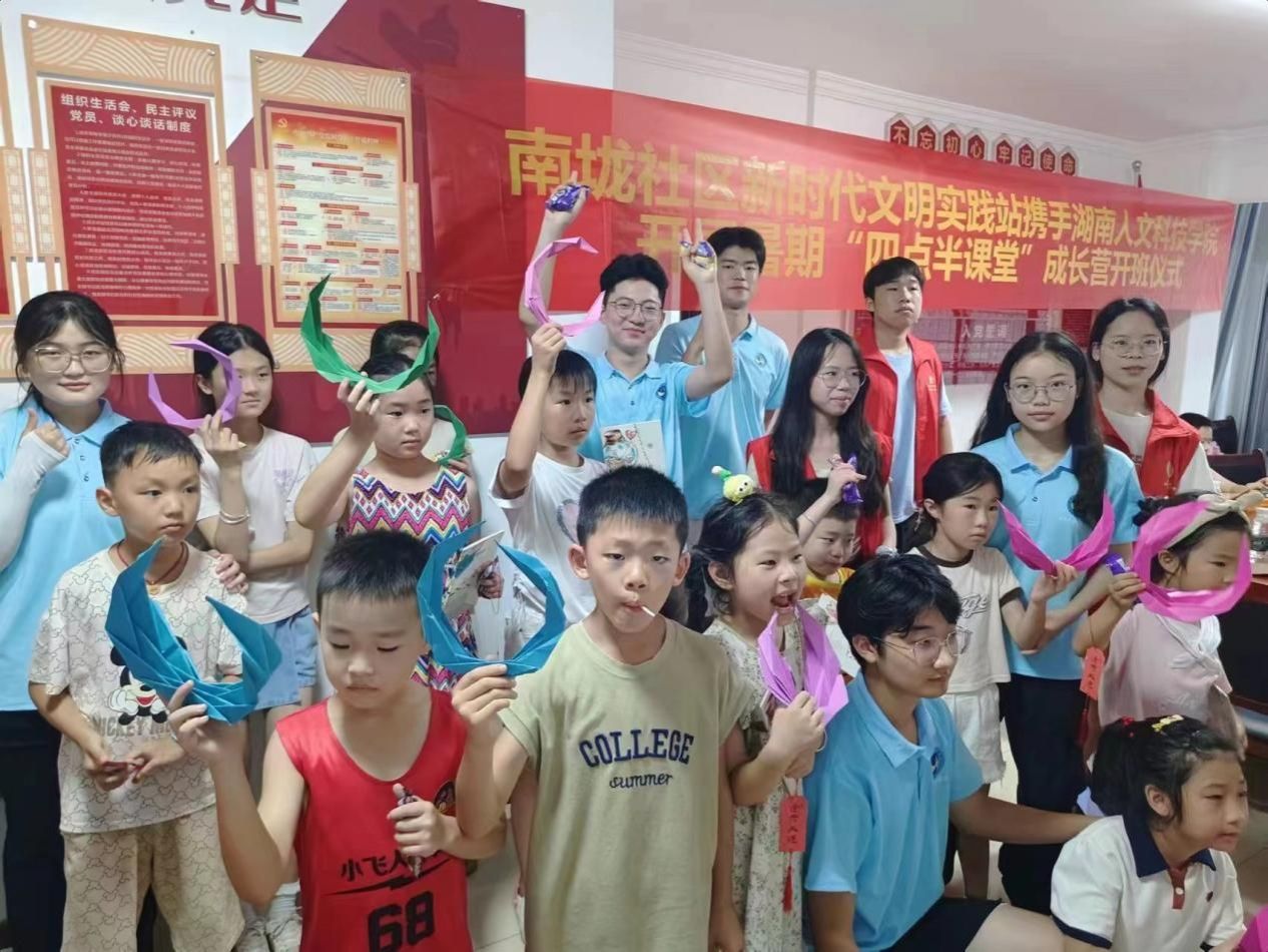 近日,肖毅、李璐玢、李英英三位老师带领beat365中文官方网站“彩虹计划“智慧潇湘服务队赴大科街道辖区内社区开展了为期一周的“四点半课堂”活动。开设创意手工、趣味数学、兴趣英语、科普知识等课程,志愿者们在教与学中以知促行、以行践知。